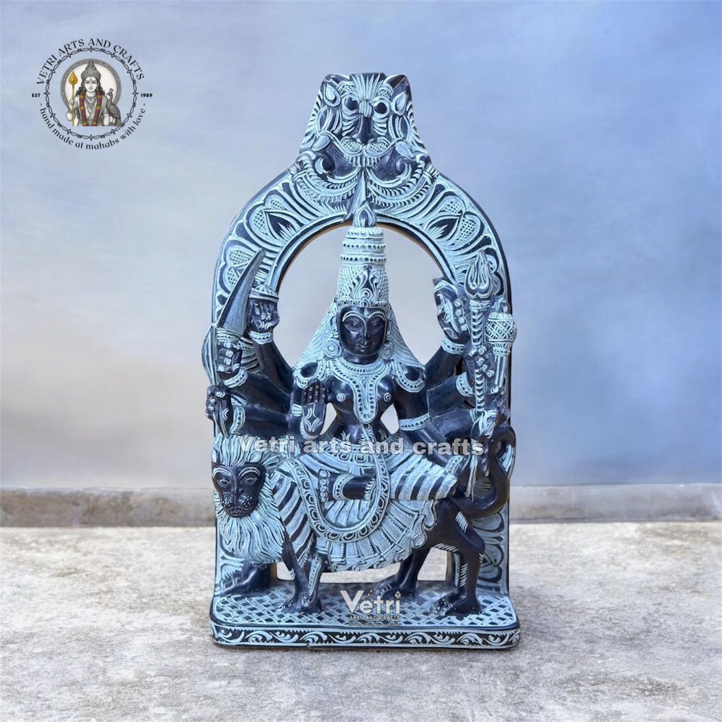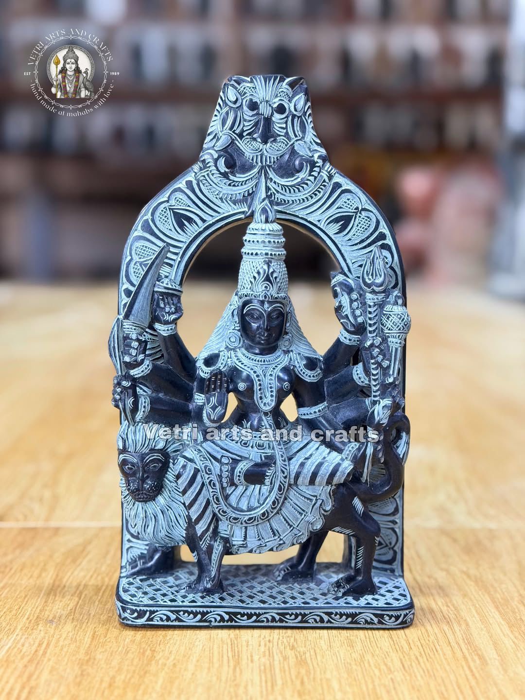 The Durga Devi Amman statue is magnificently hand-carved from premium natural green stone, depicting the Goddess seated majestically on a lion. Symbolizing supreme strength, courage, protection, and the triumph of righteousness over evil, this sacred idol radiates divine grace and maternal compassion. Intricate detailing on the facial expressions, ornaments, attire, divine attributes, and lion reflects exceptional traditional craftsmanship and devotional artistry.