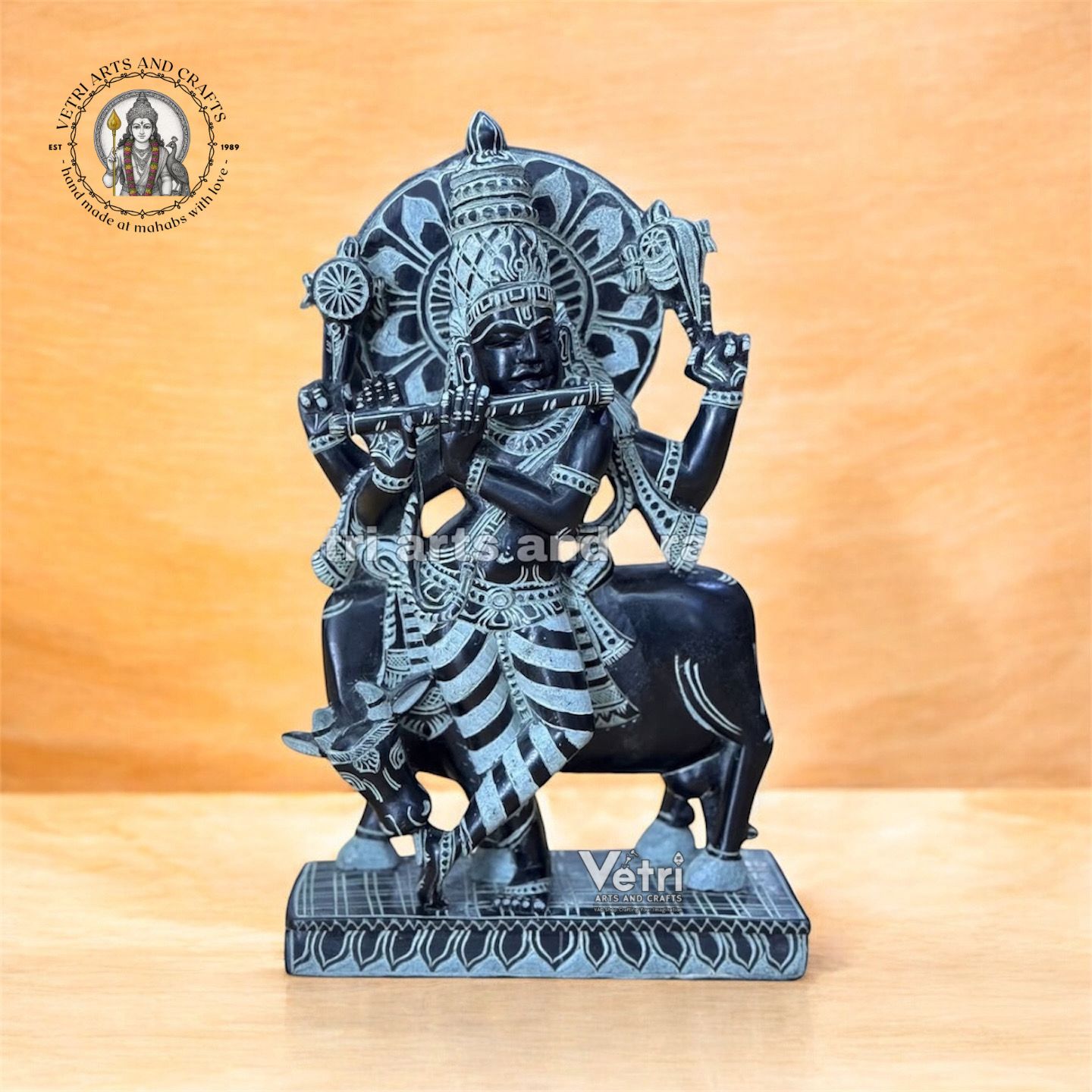 Hand-carved from premium natural green stone Depicts Lord Krishna in a serene cross-legged posture with flute and cow Intricate detailing of ornaments expressions and traditional elements Smooth polished finish with natural stone texture Durable and long-lasting ideal for devotional and aesthetic display