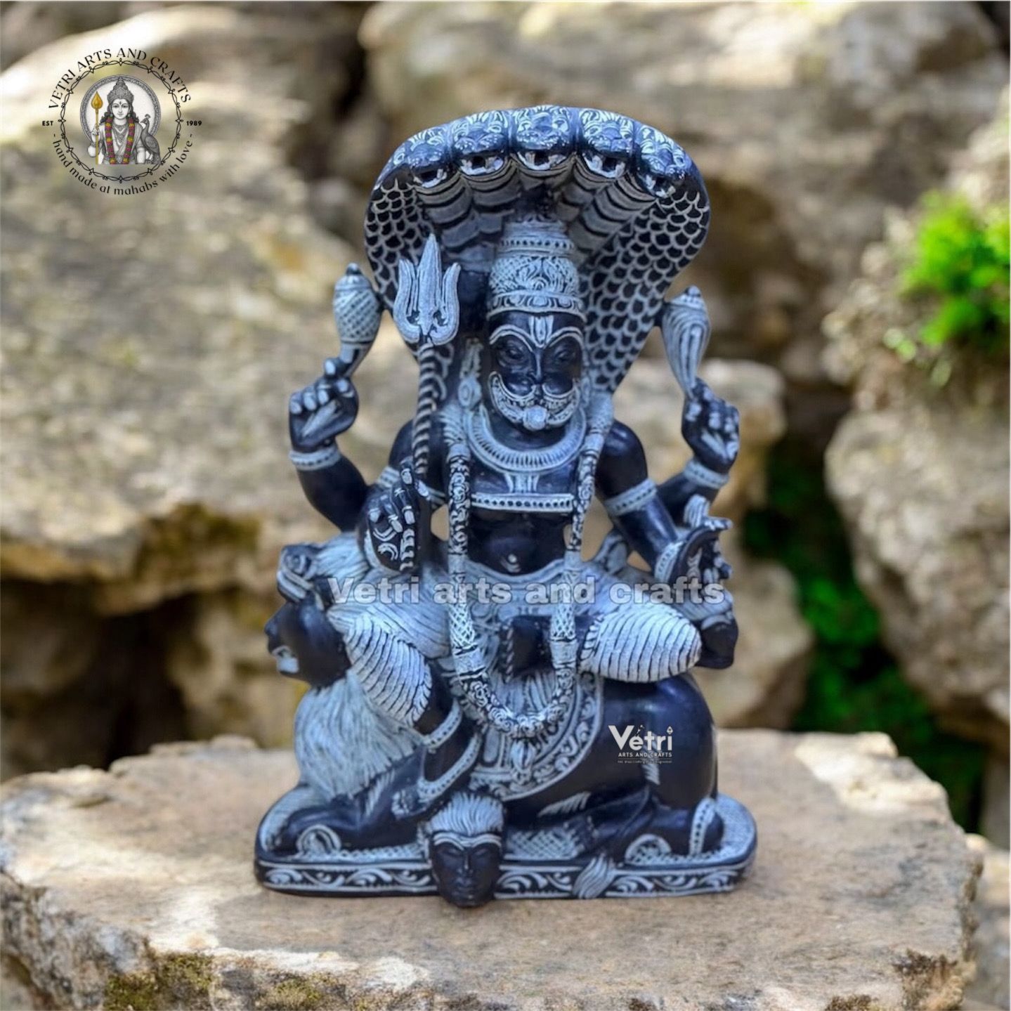 Hand-carved from premium natural green stone Powerful sitting posture on lion with serpent above Intricate detailing of ornaments, facial expressions, lion, and serpent Smooth polished finish with natural stone texture Strong, durable, and designed for long-term devotional use