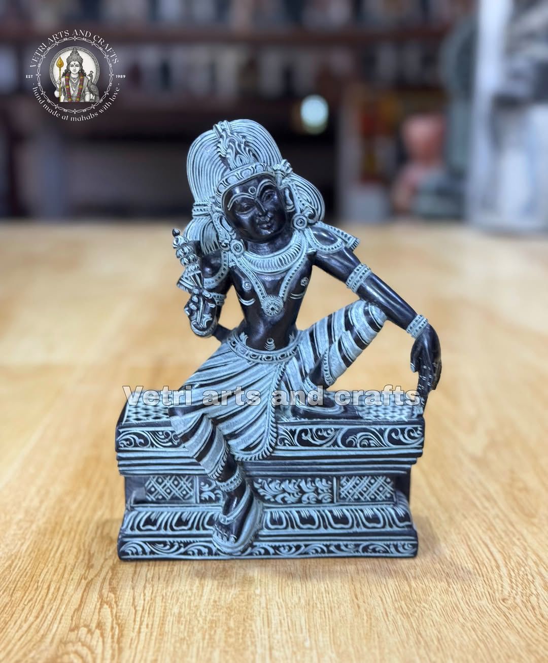 The Sastha Ayyanar statue is masterfully hand-carved from premium natural green stone, depicting the revered village guardian deity in a calm and dignified sitting posture. Worshipped as the Divine Protector and Guardian of homes and communities, this sacred idol symbolizes strength, courage, justice, and spiritual guardianship. Rich traditional detailing on the ornaments, attire, and facial expression reflects exceptional craftsmanship and devotional artistry.