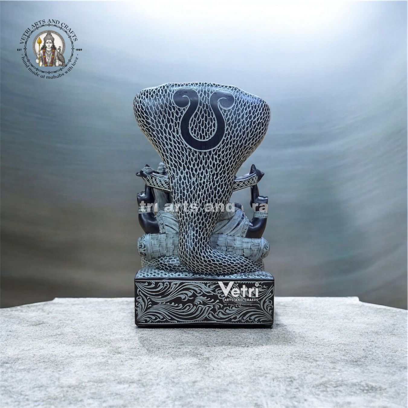 Hand-carved from premium black stone Intricate detailing of facial features, ornaments, and divine posture Beautifully sculpted five-headed snake design Smooth, polished finish with natural stone texture Solid and durable, designed for long-term devotional use