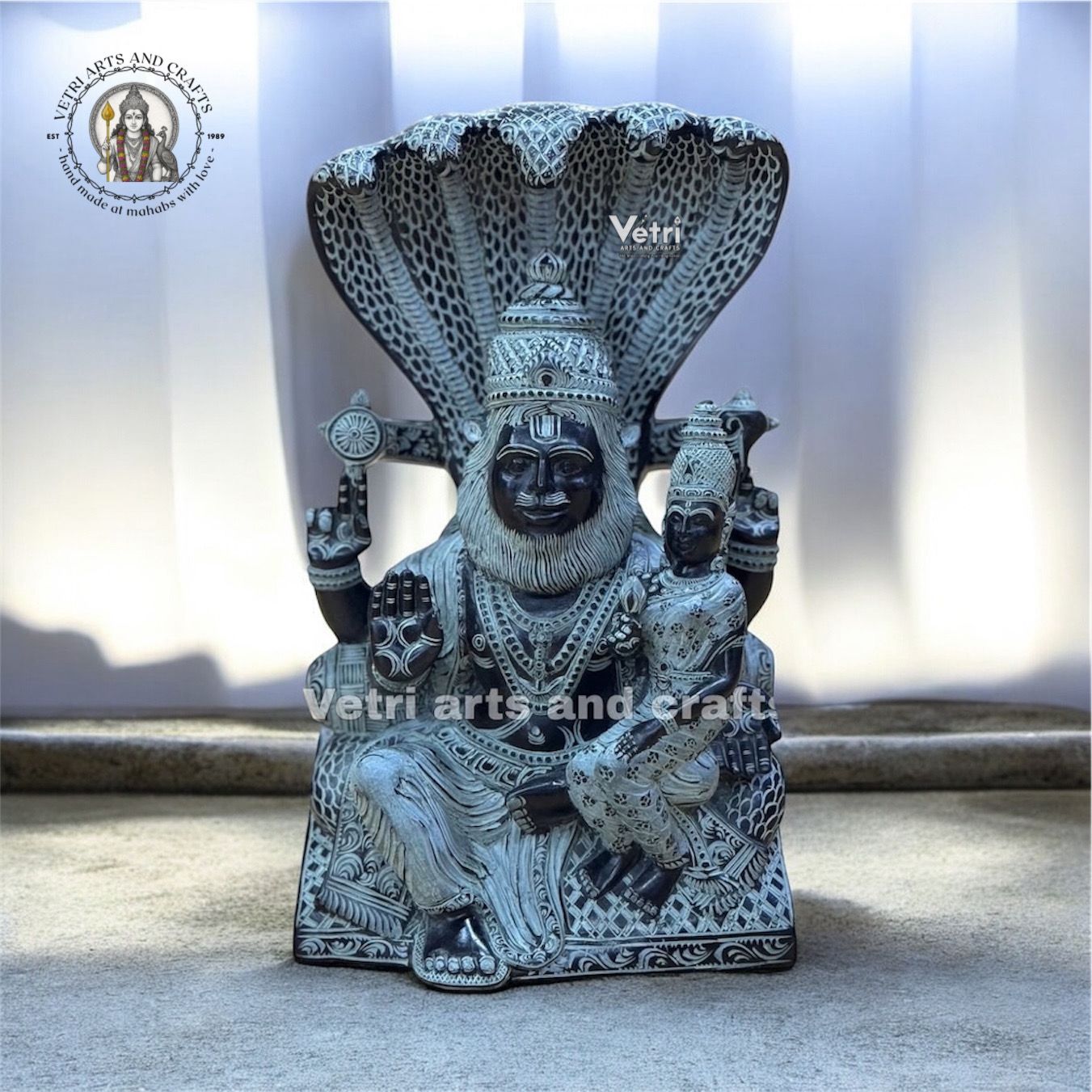 The Lakshmi Narasimha statue is exquisitely hand-carved from premium black stone, capturing the divine union of power, protection, and compassion. Depicted in a sacred sitting posture with Goddess Lakshmi seated beside Lord Narasimha, the idol radiates prosperity, courage, and spiritual strength. A beautifully sculpted five-headed snake arches above, symbolizing divine protection and cosmic energy. Intricate carvings on the ornaments, attire, facial expressions, and sacred symbols reflect masterful traditional craftsmanship.