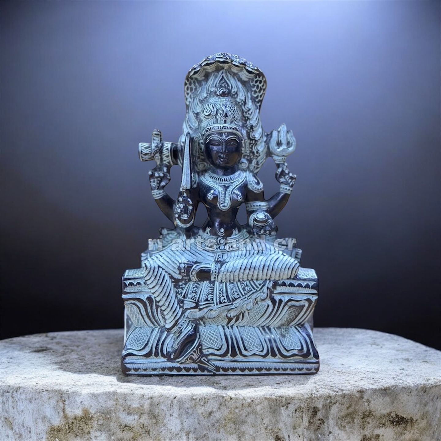 The Mariamman statue is exquisitely hand-carved from premium green stone, capturing the divine grace and powerful presence of the Goddess. Depicted in a serene sitting posture, the idol features a beautifully sculpted four-headed snake arching above her, symbolizing protection, divine energy, and spiritual strength. Intricate carvings on the ornaments, attire, and facial expression reflect traditional craftsmanship and deep devotional artistry. Every detail of the sculpture is thoughtfully crafted to highlight the sacred essence of Mariamman, who is revered for granting blessings, good health, and prosperity.