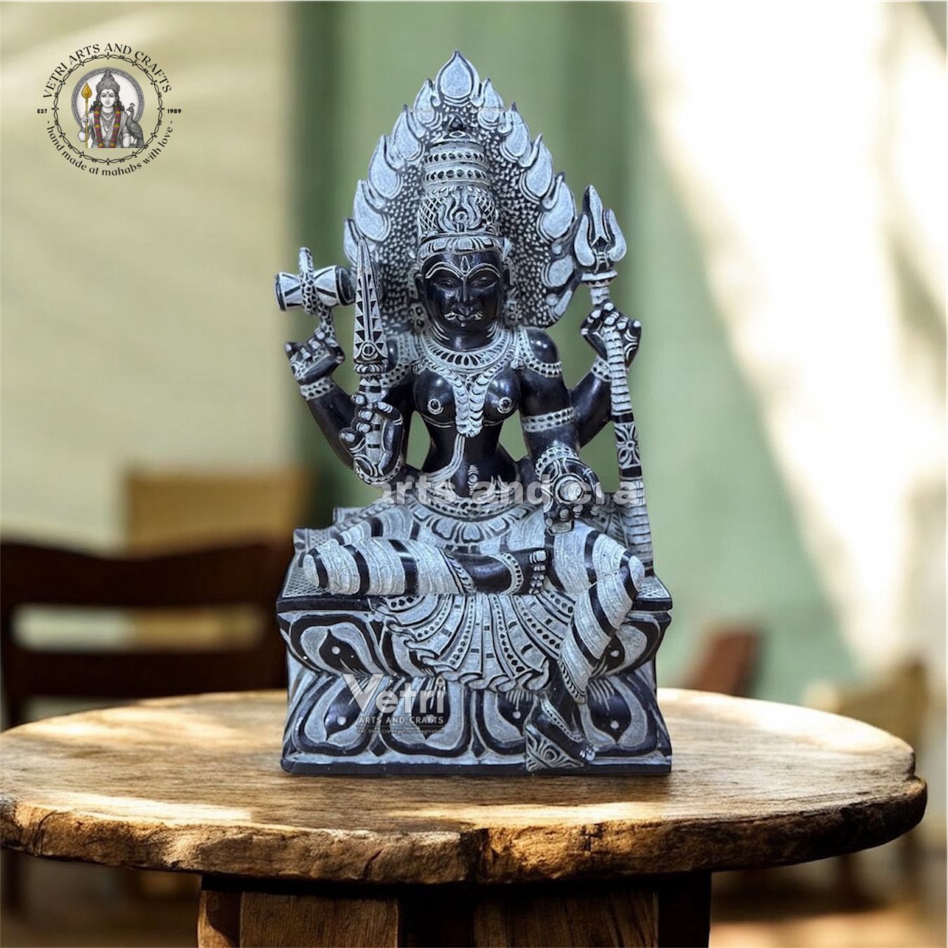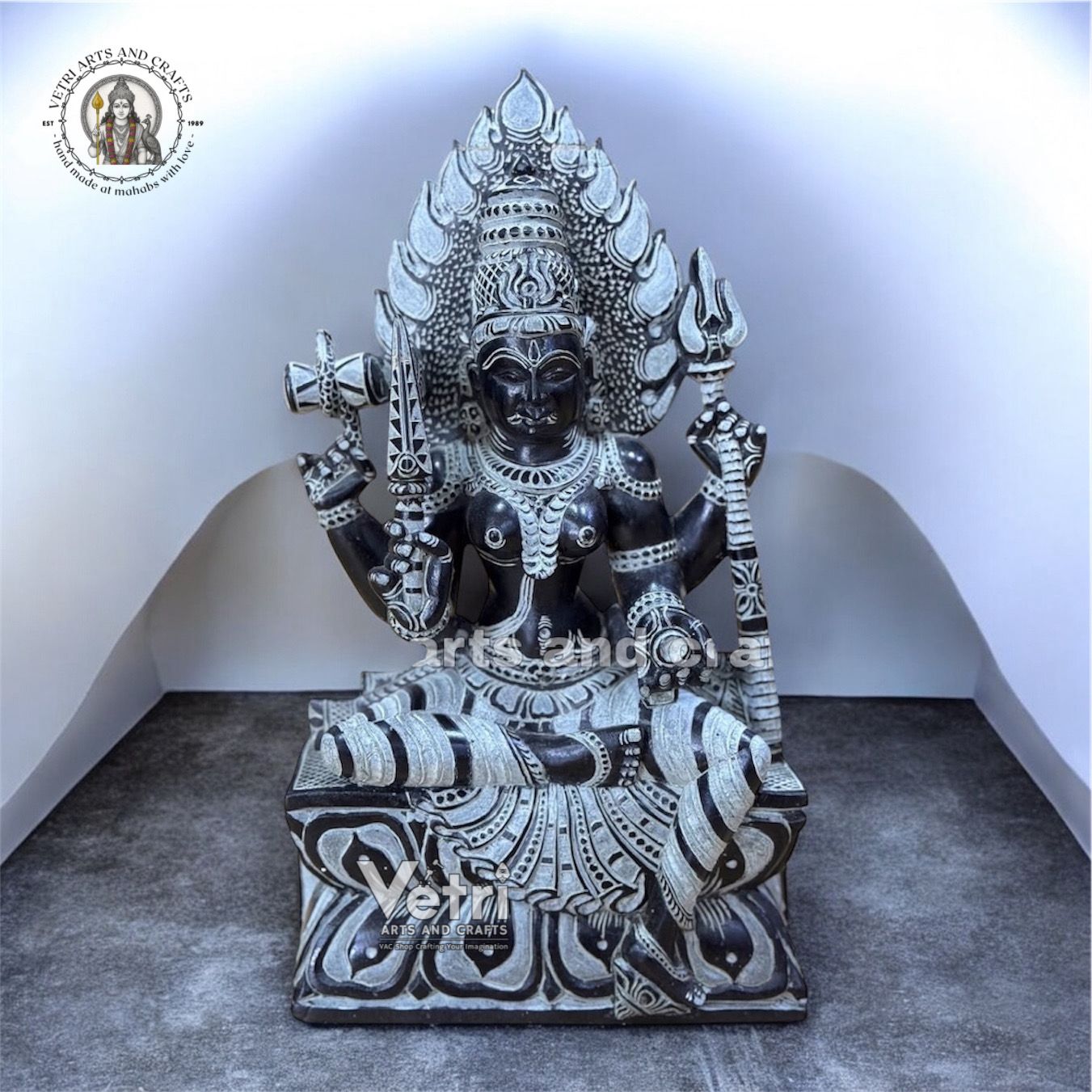 Hand-carved from premium black stone Intricate detailing of facial features, ornaments, and sitting posture Smooth, polished finish with natural stone texture Solid and durable, designed for long-term devotional use