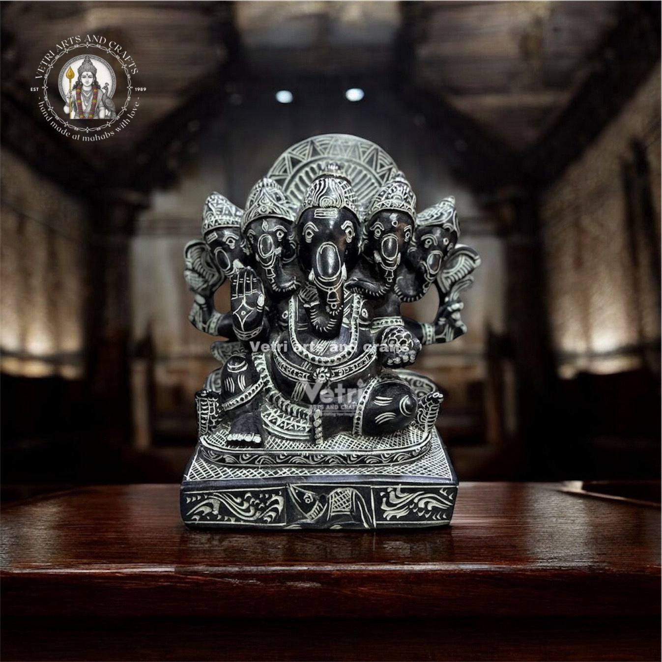 The Pancha Muga Vinayagar statue is carved from a single block of premium green granite stone, featuring the divine five-faced form of Lord Ganesha. Each face is intricately sculpted to represent wisdom, protection, strength, and spiritual energy. The rich detailing on the crown, ornaments, and posture reflects traditional craftsmanship and powerful divine presence. Perfect for home temples, pooja rooms, meditation spaces, or as a sacred spiritual gifting option.