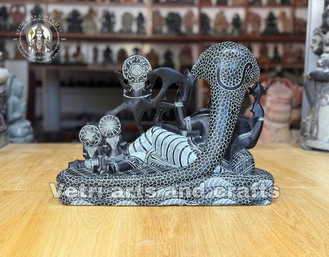 The Ranganathaswamy statue with Sridevi and Bhudevi is exquisitely hand-carved from premium natural green stone, reflecting divine grace, devotion, and traditional South Indian temple artistry. Depicted in a serene and majestic posture, Lord Ranganathaswamy symbolizes peace, cosmic protection, and spiritual harmony, while the presence of Sridevi and Bhudevi represents prosperity, compassion, and divine balance. Intricate detailing on the ornaments, attire, facial expressions, and divine forms highlights masterful craftsmanship and devotional artistry.
