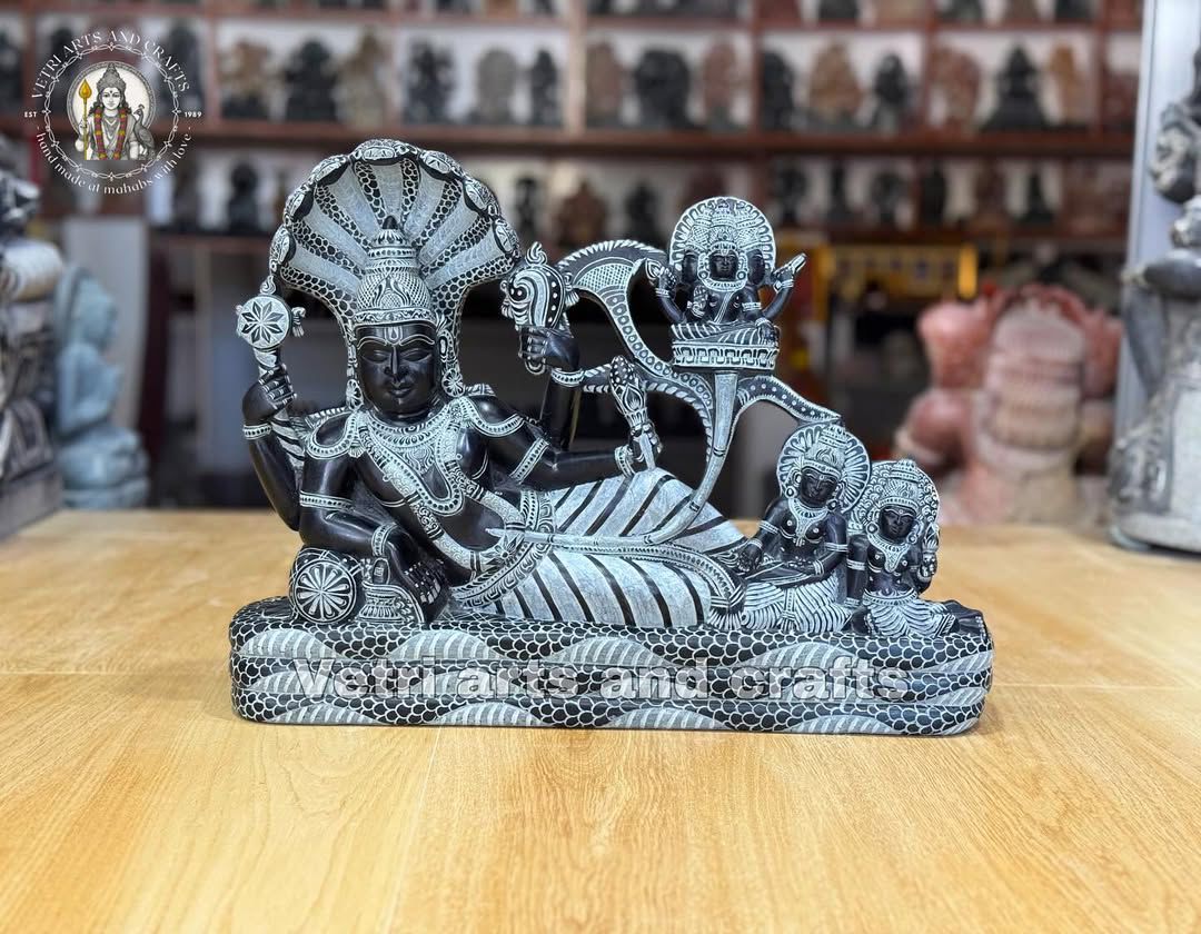 A finely hand-carved Ranganathaswamy statue with Sridevi and Bhudevi, crafted from premium green stone. Features intricate traditional detailing and a serene divine presence, ideal for pooja rooms, home temples, or temple installations